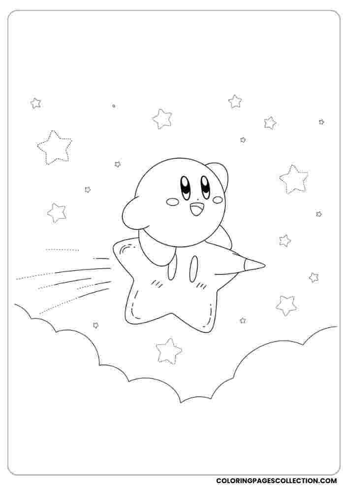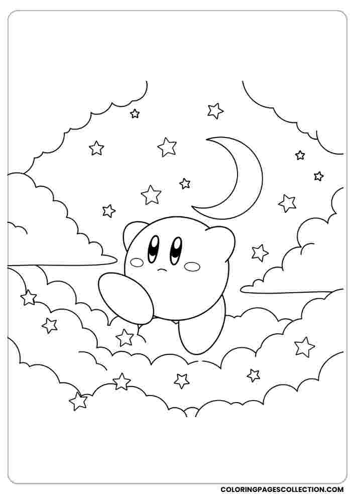 Let your artistic imagination take over while coloring this Kirby in the dreamy night sky page. Use bright, soft, or even mixed shades to make it shine.