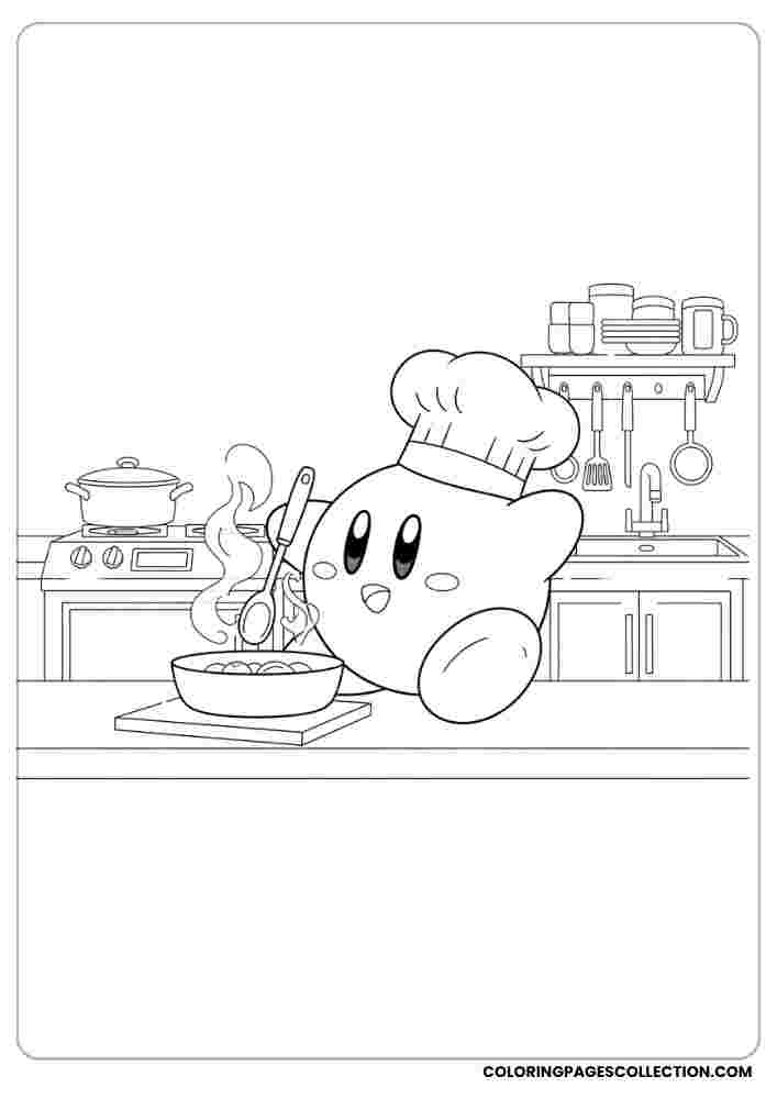 Be ready for early creativity with its detailed Kirby cooking with a chef hat. Let the color page and your imagination run with colors and make it unique.