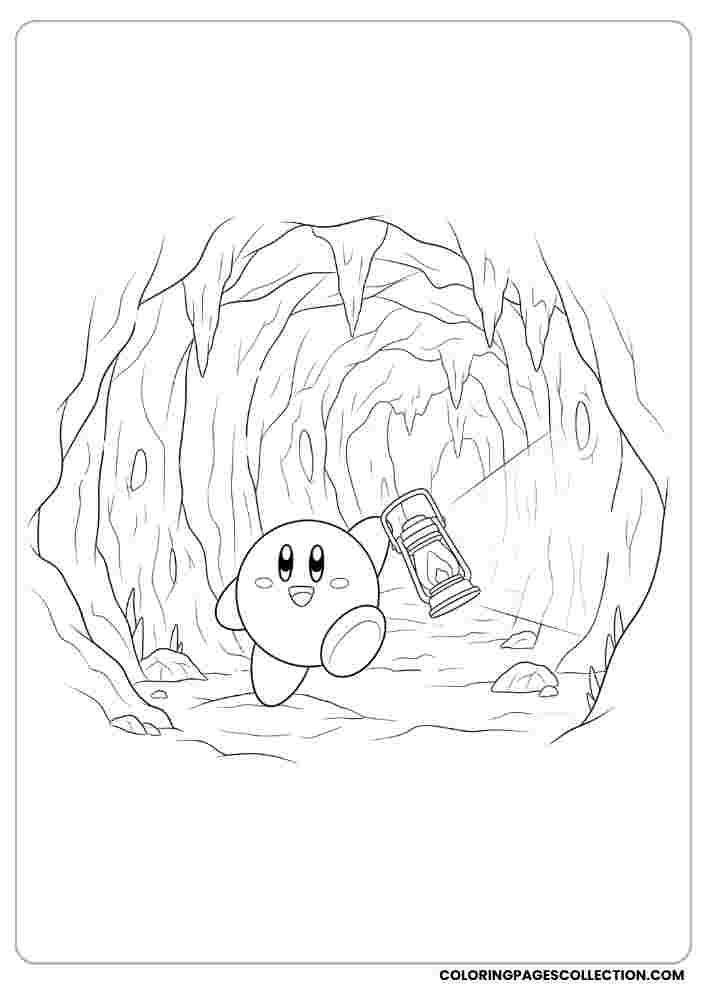 Make your coloring tools clear and dive into this carefully illustrated Kirby exploring a cave with a lantern. Filled with details ready for you to enjoy.