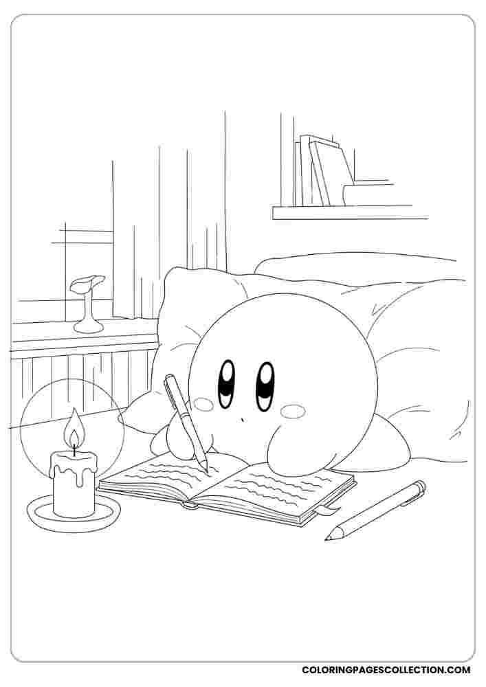 Transform this detailed Kirby writing by candlelight coloring into a fantastic work of art. Have fun with the process and have fun making it.