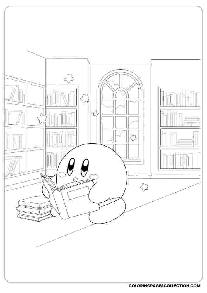 Take the time to relax and fill in this wonderful Kirby reading in a library with stars coloring page. Let your imagination guide your color choices.