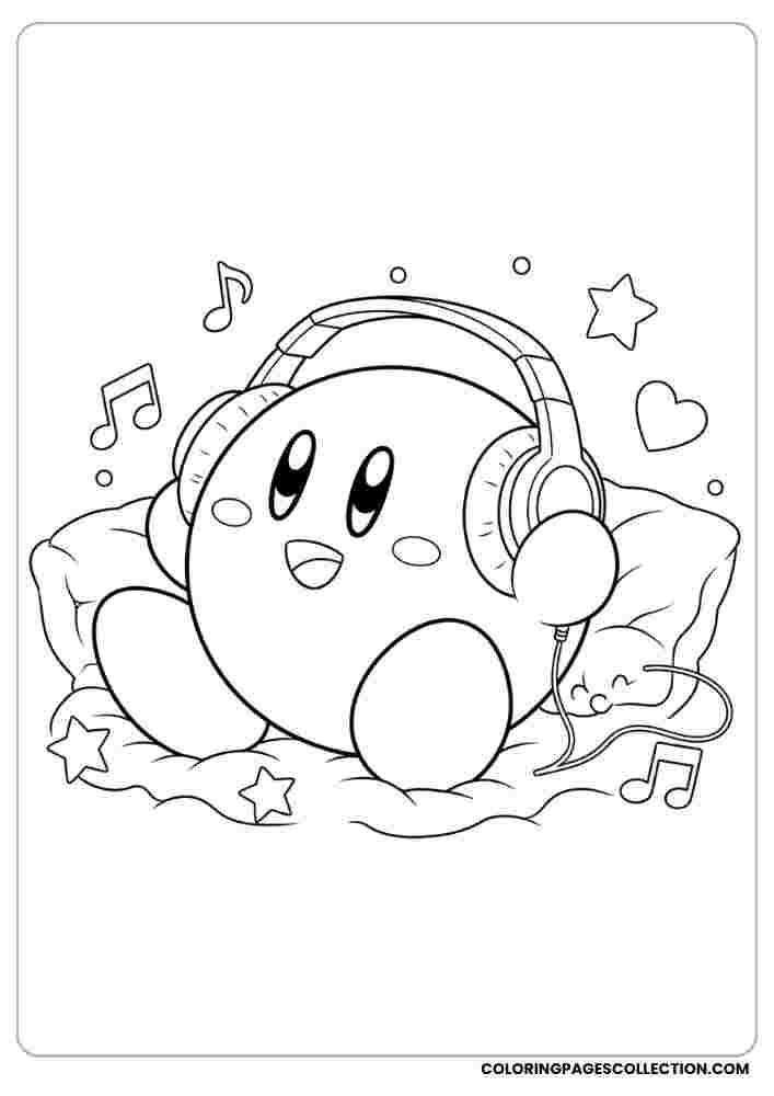 Enjoy a peaceful coloring with this beautifully designed Kirby listening to music with headphones page. Make it as lively or subtle as you wish.