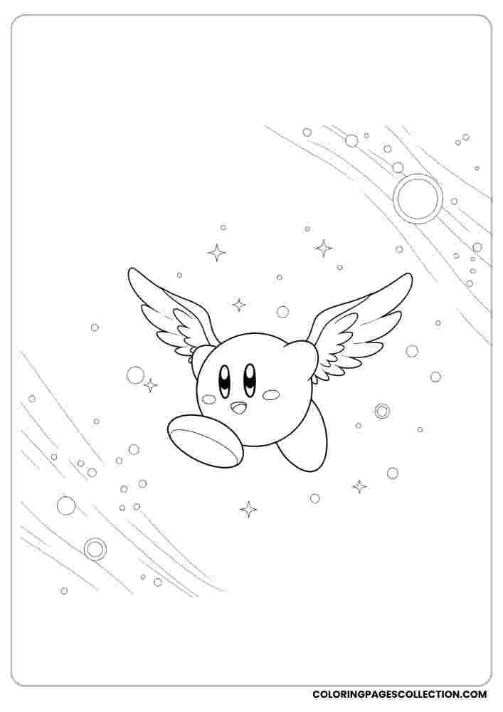 This fun and detailed Kirby with magical wings in the galaxy coloring page is waiting for your magical colors.