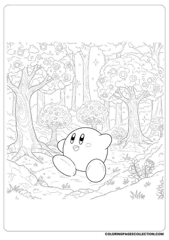 Let your imagination take the lead when exploring this detailed Kirby in a magical forest with glowing trees, and enjoy making it a colorful masterpiece.