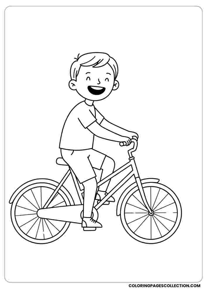 Transform this detailed picture of a boy riding a bicycle with a big smile. Coloring a fantastic work of art. Have fun with the process and have fun making it.