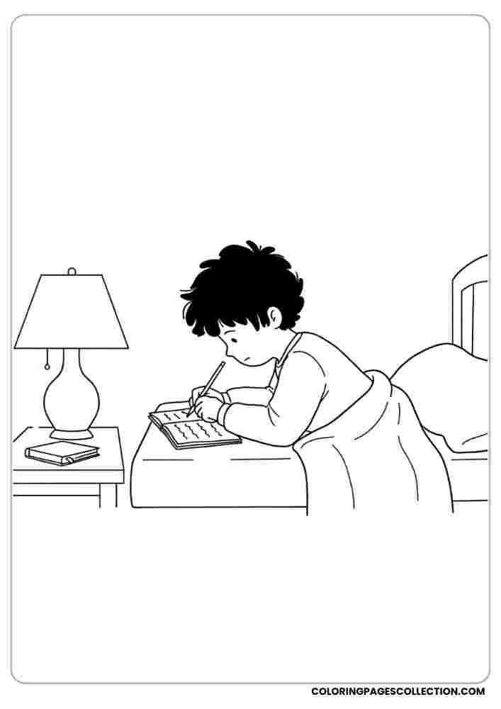 Let your inner artist take control and do this beautiful boy writing in his journal at night. The Coloring page is really unique.